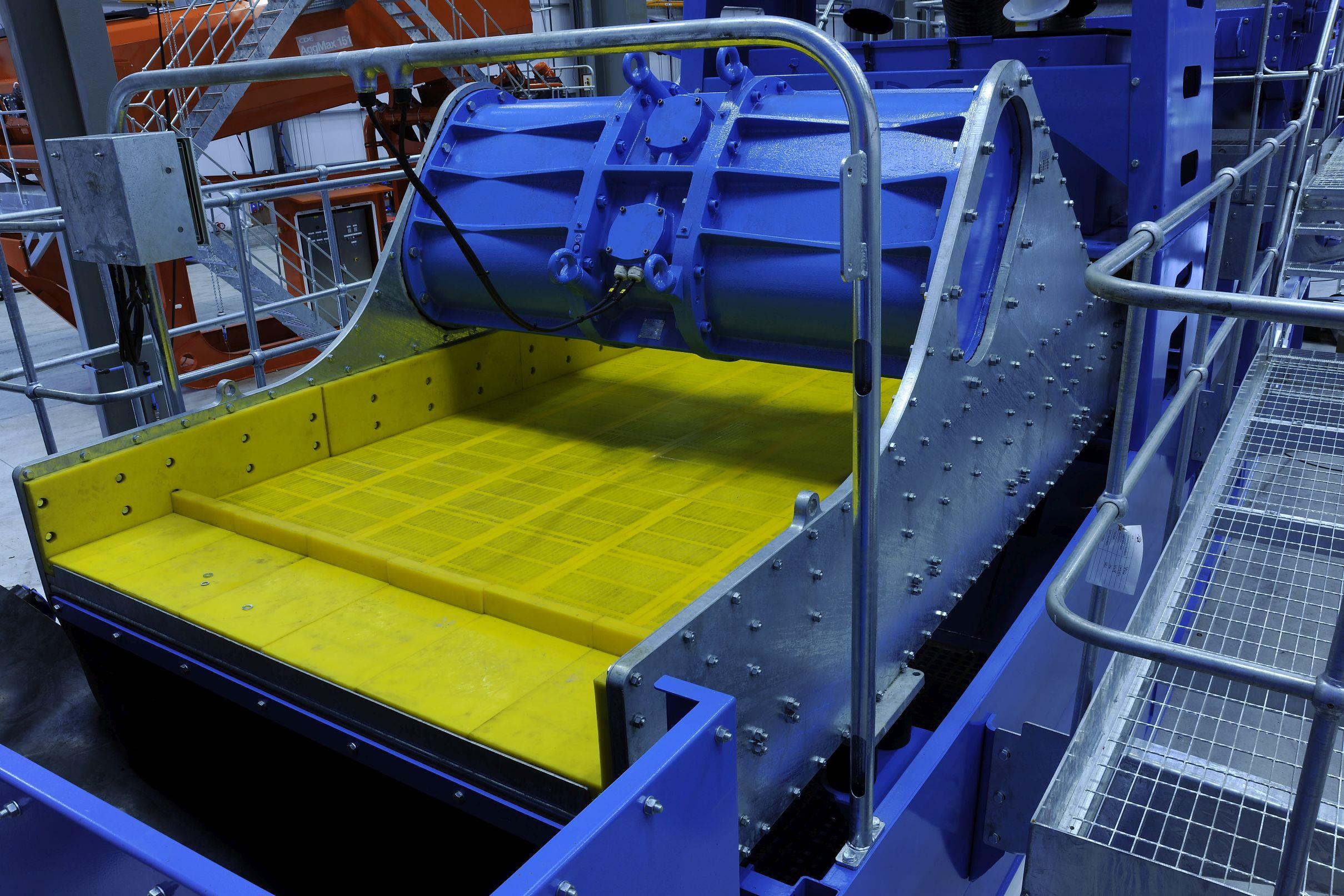 These screens dewater material and sludge and produce bulk material which can be transported with standard means. They are also used to recover solid particles from liquids, muds or sludges. The robust screen frame is manufactured in either a welded or a bolted and glued design, depending on the application. The angle of vibratory agitation is optimized to reduce moisture of the solids to minimum values. The unit is supported by a screen deck inclination of +3° (rising). All screen decks available can be used.