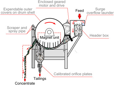 Two basic tank styles are offered. The drum rotates in the same direction as the slurry flow in the concurrent tank style. The slurry enters the feedbox and is channeled underneath the submerged drum. The slurry then flows into the magnetic field generated by the drum. The magnetite is attracted by the magnetic field, collected on the drum surface, and rotated out of the slurry flow. This tank style results in a very clean magnetic product.