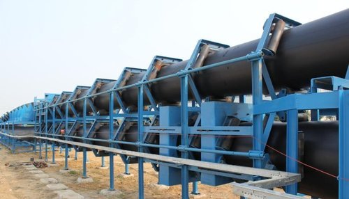 On the carrying side in tail end, skirts are provided to prevent spillage of the loaded material. During belt moving in the direction of travel, the belt is troughed via transition idlers. From the loading point, the conveyor belt is further gradually to the full pipe form. Adjustable troughing idlers along the section guide the belt into the formation of the pipe shape. The overlap in belt is at the top of the pipe formation and finger rolls are used to guide the belt in pipe formation.